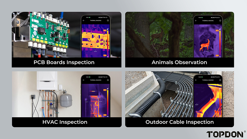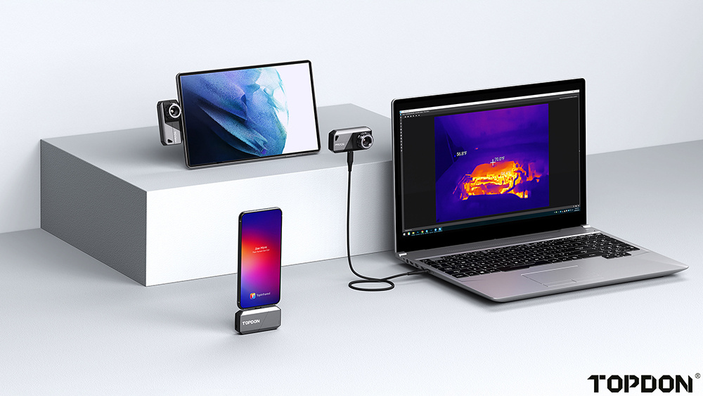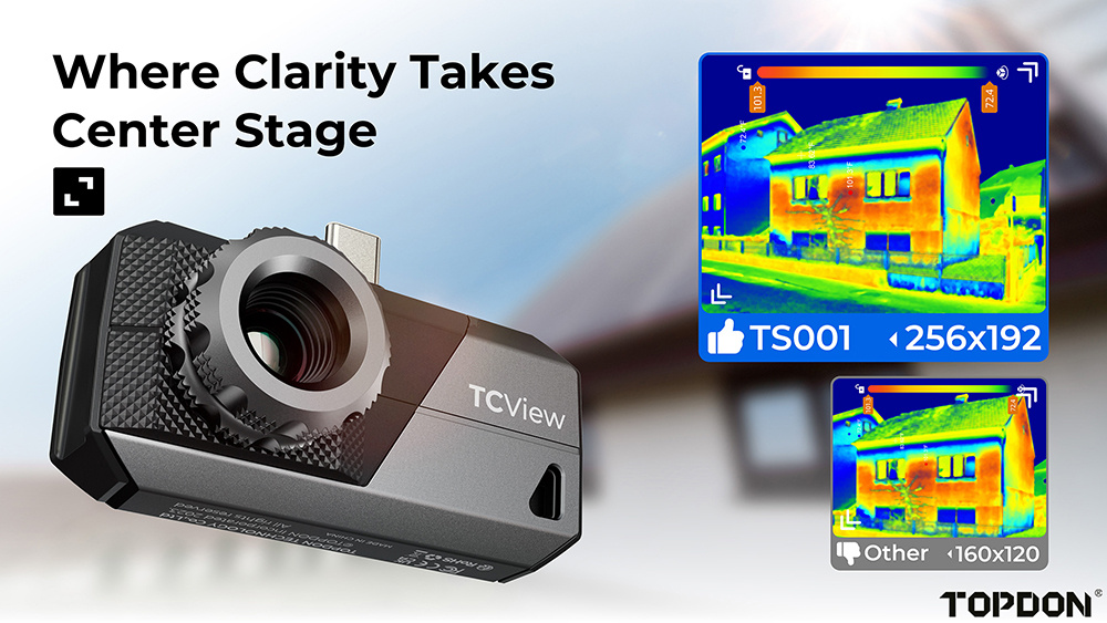 TS001 je vybavena režimy pro měření a pozorování, které poskytují přesné údaje o teplotě a intuitivní vizualizaci rozložení tepla. Je ideálním nástrojem pro profesionály, jako jsou domácí inspektoři, automobiloví technici a elektrikáři. Díky této termokameře můžete rychle odhalovat, diagnostikovat a řešit problémy s maximální přesností a efektivitou.
