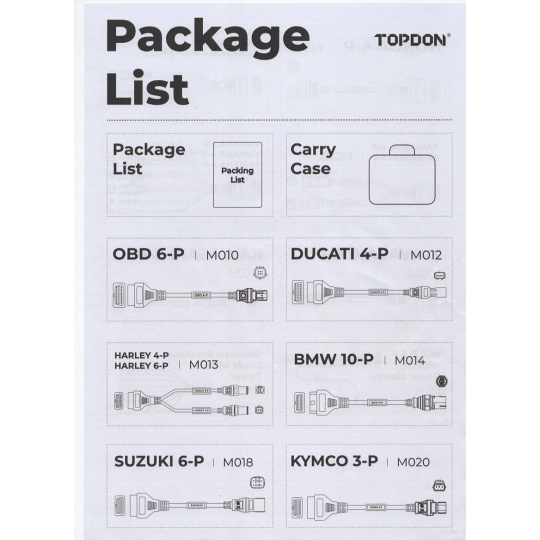 Topscan Moto Master Kabelová Sada slouží k propojení motocyklu s diagnostickým zařízením TopScan Moto. Tento adaptér umožňuje správné připojení motocyklů konkrétní značky k zařízení, což umožňuje čtení diagnostických dat a provádění servisních kontrol. Použití kabelové sady je nezbytné pro motocykly, které nejsou vybaveny standardním OBD-II portem.