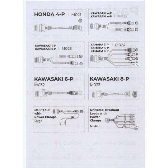 Kabelová sada je navržena pro spolehlivý přenos dat mezi motocyklem a diagnostickým zařízením, což vám usnadní provádění diagnostiky, zjištění závad a optimalizaci výkonu. Tato sada obsahuje značky BMW, Harley, Ducati, Kawasaki, Honda, Yamaha, Suzuki.