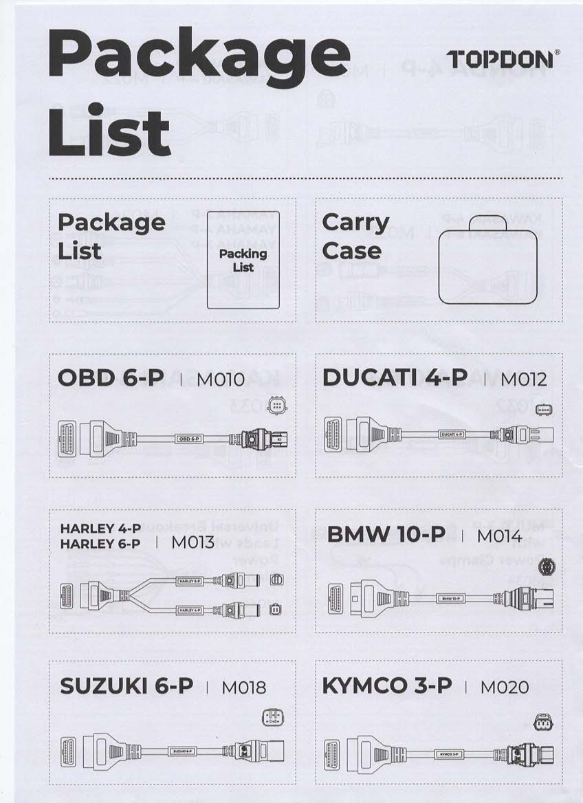 Topscan Moto Master Kabelová Sada slouží k propojení motocyklu s diagnostickým zařízením TopScan Moto. Tento adaptér umožňuje správné připojení motocyklů konkrétní značky k zařízení, což umožňuje čtení diagnostických dat a provádění servisních kontrol. Použití kabelové sady je nezbytné pro motocykly, které nejsou vybaveny standardním OBD-II portem.