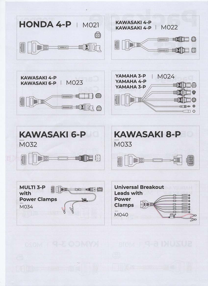 Kabelová sada je navržena pro spolehlivý přenos dat mezi motocyklem a diagnostickým zařízením, což vám usnadní provádění diagnostiky, zjištění závad a optimalizaci výkonu. Tato sada obsahuje značky BMW, Harley, Ducati, Kawasaki, Honda, Yamaha, Suzuki.
