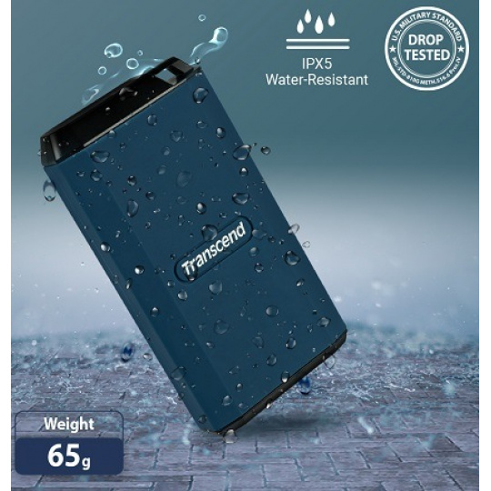 Transcend's matchbox-sized ESD410C features an incredibly rugged and water-resistant construction. An integrated lanyard hole allows for a wide range of attachment options. ESD410C's IPX5* rating and MIL-STD-810G US military drop-test compliance means that you can rest assured that your data is fully protected against the elements, even enduring a 3-meter drop!**