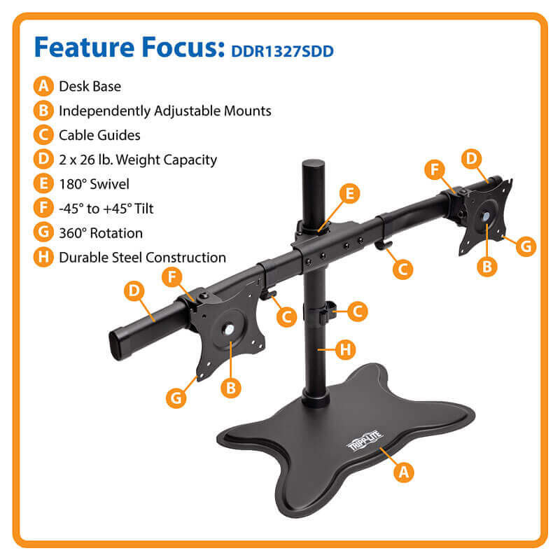 Stojan pro montáž pro dva monitory pro 13" až 27" ploché obrazovky Plně pohyblivý stolní stojan připevňuje 2 ploché monitory na nezávisle nastavitelná ramena a jedinou základnu, aby uvolnil cenný prostor na vašem stole nebo pracovní stanici. Doporučeno pro domácí nebo kancelářské použití. *Hodí se pro většinu plochých displejů od 13 do 27 palců *Nastavení jedním dotykem pro pohodlné sledování *Otočí se o 360° pro zobrazení na výšku nebo na šířku *Otočení o 180° a náklon -45° až +45° pro široký rozsah pohybu *Podporuje až 26 lb (11,8 kg) na držák VESA