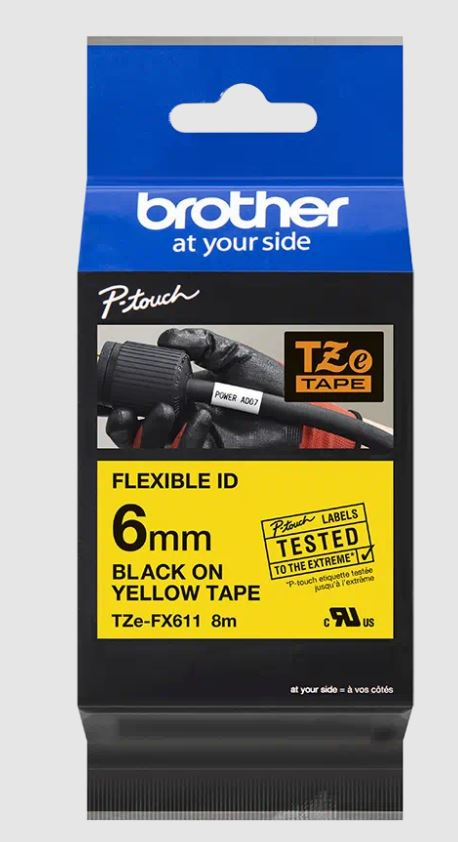 Ideální pro vytváření identifikačních štítků pro kabely, vodiče, PVC trubky nebo jiné válcovité tvary. Speciální lepidlo pásky Brother TZe-FX611 s černým tiskem na žlutém podkladu zajišťuje, že vaše důležité štítky budou mít dlouhou životnost. Kompatibilní s tiskárnami štítků P-touch, které mají logo TZ nebo TZe na krytu kazety s páskou.