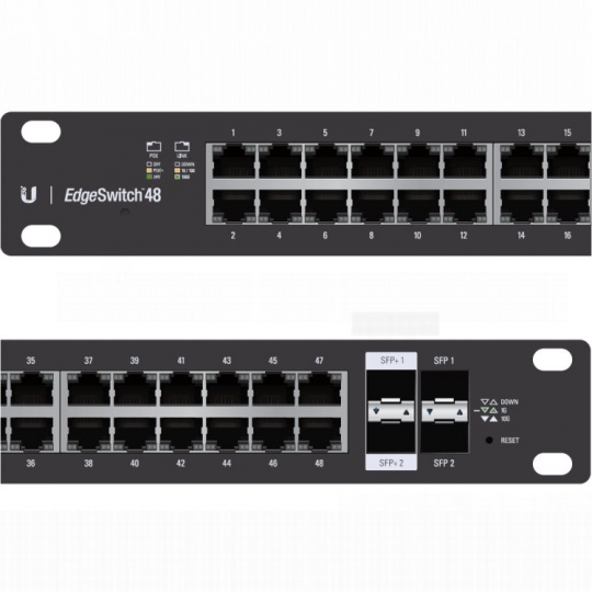 Gigabitový L3 PoE switch Ubiquiti EdgeSwitch ES-48-500W v 19" rackmount provedení s maximálním výkonem PoE napájení 500W. Managovatelný switch s 48 gigabit metalickými porty + 2 gigabitové SFP porty + 2 desetigigabitové SFP+ porty a celkovou propustností 70Gbps. PoE na každém portu je možné nastavit jako aktivní PoE 802.3af/at nebo pasivně 24V s maximálním výkonem 34W/port.