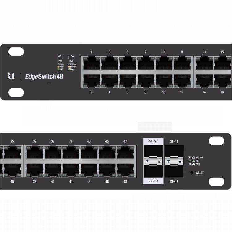 Gigabitový L3 PoE switch Ubiquiti EdgeSwitch ES-48-500W v 19" rackmount provedení s maximálním výkonem PoE napájení 500W. Managovatelný switch s 48 gigabit metalickými porty + 2 gigabitové SFP porty + 2 desetigigabitové SFP+ porty a celkovou propustností 70Gbps. PoE na každém portu je možné nastavit jako aktivní PoE 802.3af/at nebo pasivně 24V s maximálním výkonem 34W/port.