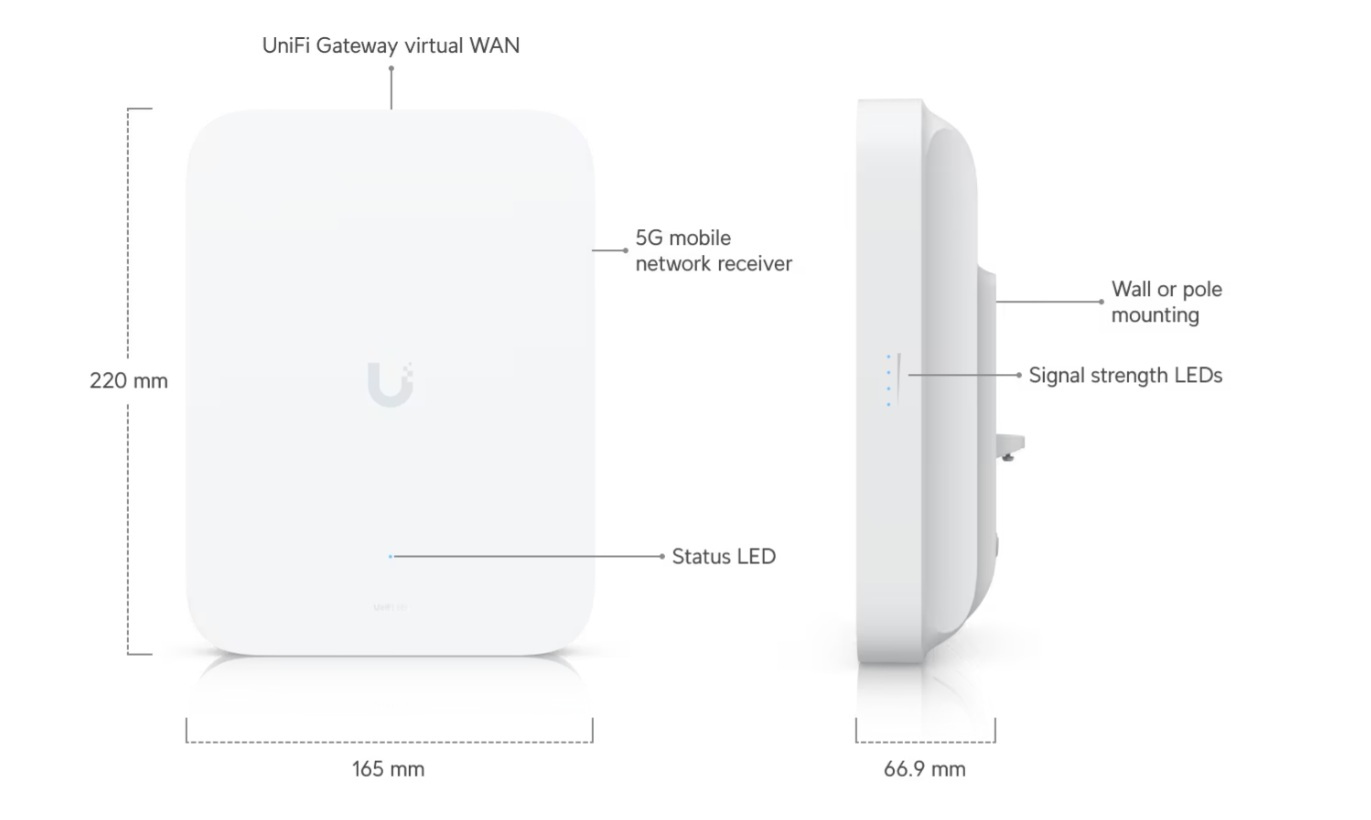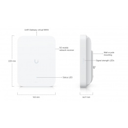 Plnohodnotný venkovní 5G modem s maximální rychlostí až 3,4 Gb/s, určený pro UniFi konzole a Cloud Gateway. Zařízení je navrženo pro venkovní instalace, disponuje směrovými anténami, vzdálenou správou SIM karet a podporou duální SIM pro bezvýpadkový provoz.