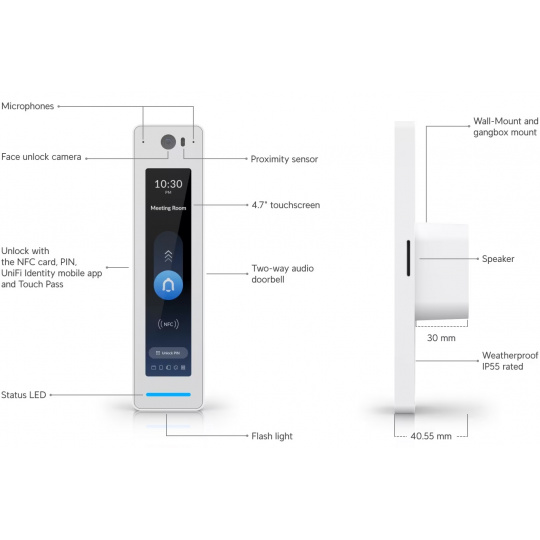 Dveře jednoduše odemknete pomocí obličeje, karty NFC, kódu PIN, mobilní aplikace UniFi Identity či Touch Pass.