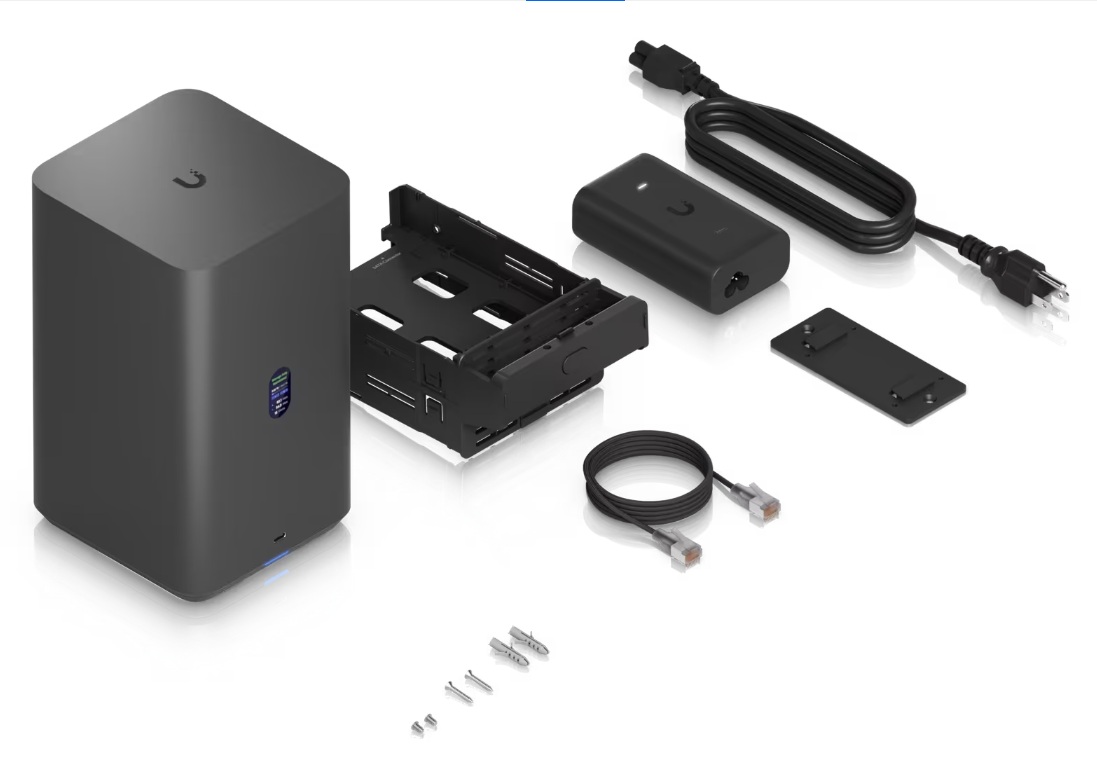 * Zařízení disponuje barevným 1.47" LCM displejem pro rychlé informace o stavu a podporuje správu přes UniFi Drive aplikaci.