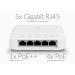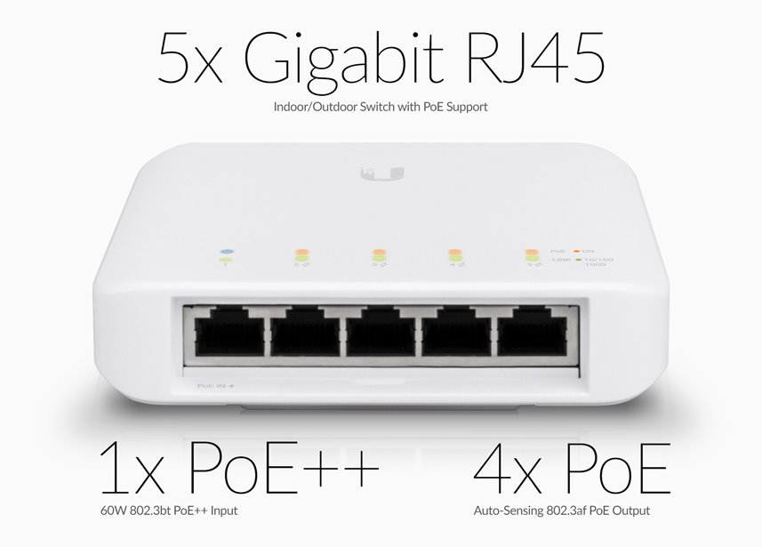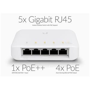 USW-FLEX je 5-portový venkovní Gigabitový switch s možností PoE-In a PoE-Out na 4 portech. Switch umožňuje na výstupních portech aktivní napájení typu 802.3af, což dává celkově 15.4W na každém portu.