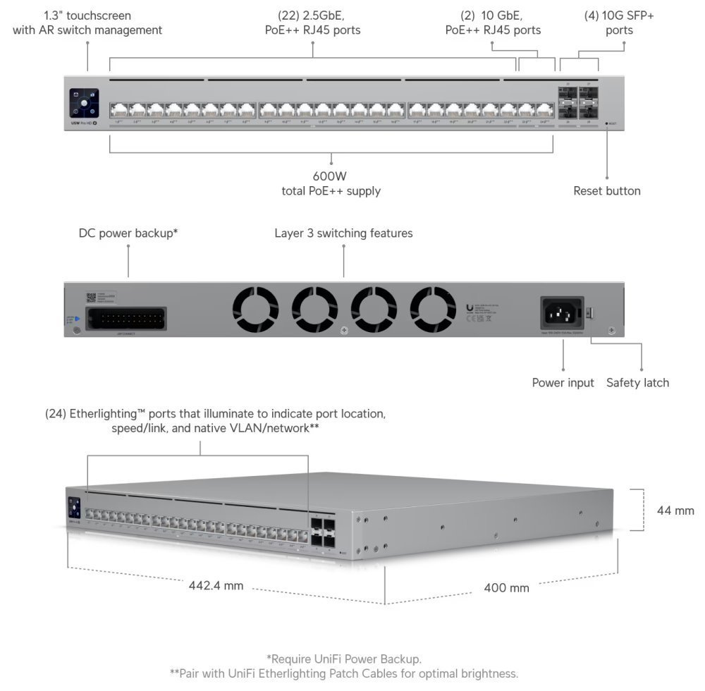 Ubiquiti UniFi Switch Pro HD 24 PoE UniFi Switch (USW-Pro-HD-24) je spolehlivý L3 switch s managementem v profesionálním provedení určený pro montáž do racku 1U. Jednou z největších předností je podpora PoE dle normy IEEE 802.3at/bt na každém portu. Klíčové vlastnosti *vysoce výkonný, multigigabitový switch *disponuje 1,3" dotykovým LCM displejem pro usnadnění ovládání *RPS DC vstup, který poskytuje redundantní napájení, pro případ výpadku primárního *Porty s podsvícením Etherlighting, které indikují umístění portu, rychlost/linku a nativní VLAN/síť *22× 2,5GbE port PoE++ *2× 10GbE port PoE++ *4× 10G slot SFP+ *600 W celkový PoE budget *Správa pomocí UniFi Network (verze 8.6.9 a novější) ZÁKLADNÍ SPECIFIKACE Porty: 2x 10/5/2,5/1 GbE, 100 MbE RJ45; 22x 2,5/1 GbE, 100/10 MbE RJ45; 4x 10/1G SFP+ porty Kapacita switche: 230 Gb/s (115 Gb/s neblokující) Podpora PoE: ano (802.3af/at/bt, 600 W PoE budget) Typ napájení: Univerzální vstup, 100–240 V AC, 50/60 Hz; DC vstup USP-RPS Napájení: AC/DC, interní, 660W Rozměry: 442,4 x 400 x 44 mm Hmotnost: 6,4 kg (bez montážních držáků) Max. spotřeba energie: 56W (bez PoE výstupu) Tlačítko obnovení továrního nastavení: ano Možnosti napájení: Maximální výkon PoE na jeden port je 15,4 W Maximální výkon PoE+ na jeden port je 30 W Maximální výkon PoE++ na jeden port je 60 W Maximální výkon tohoto modelu (celkový PoE budget) je 600 W