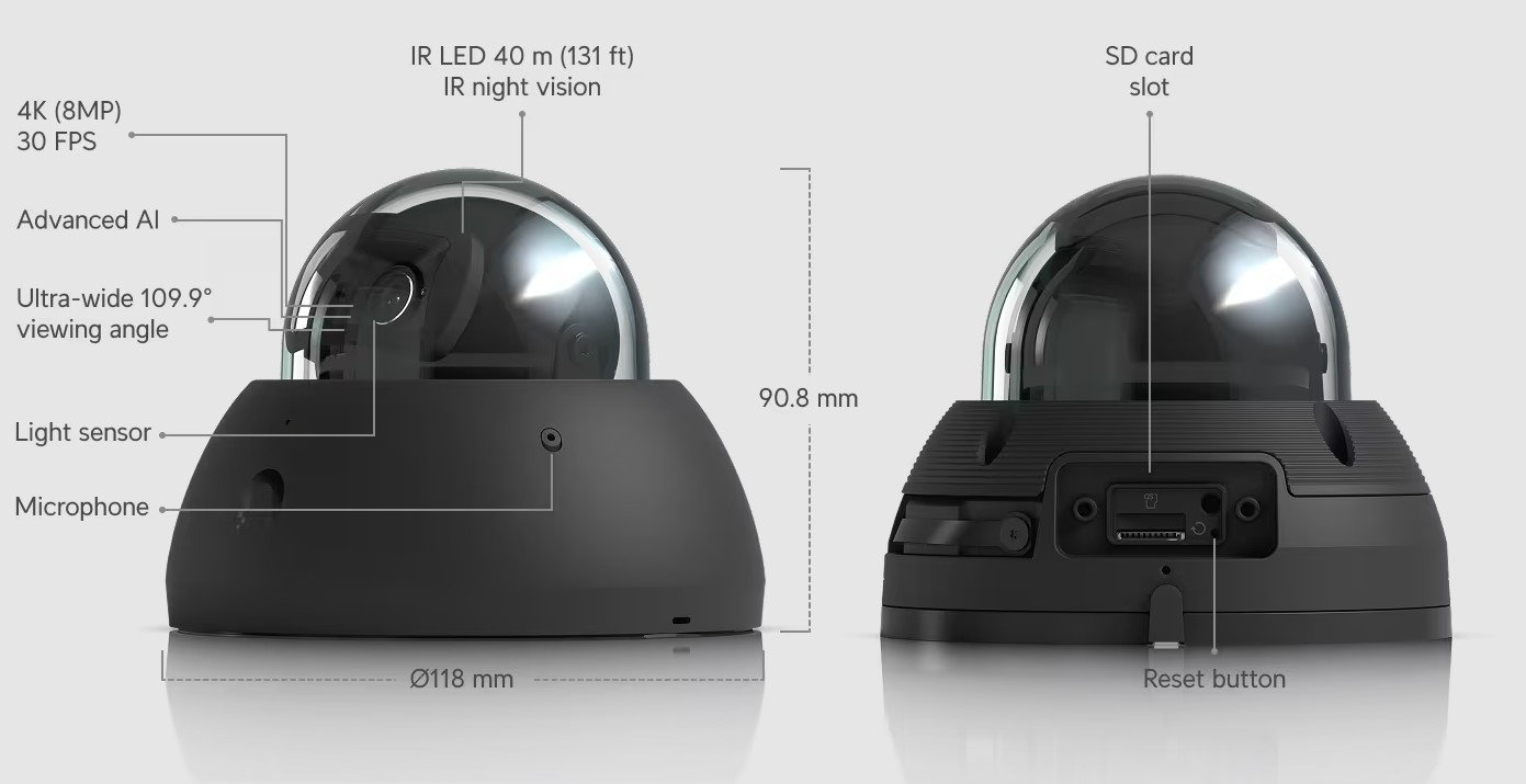 Kamera snímá 8 Mpx video (3840 x 2160) při 30 snímcích za sekundu s fixním 2,8mm objektivem.