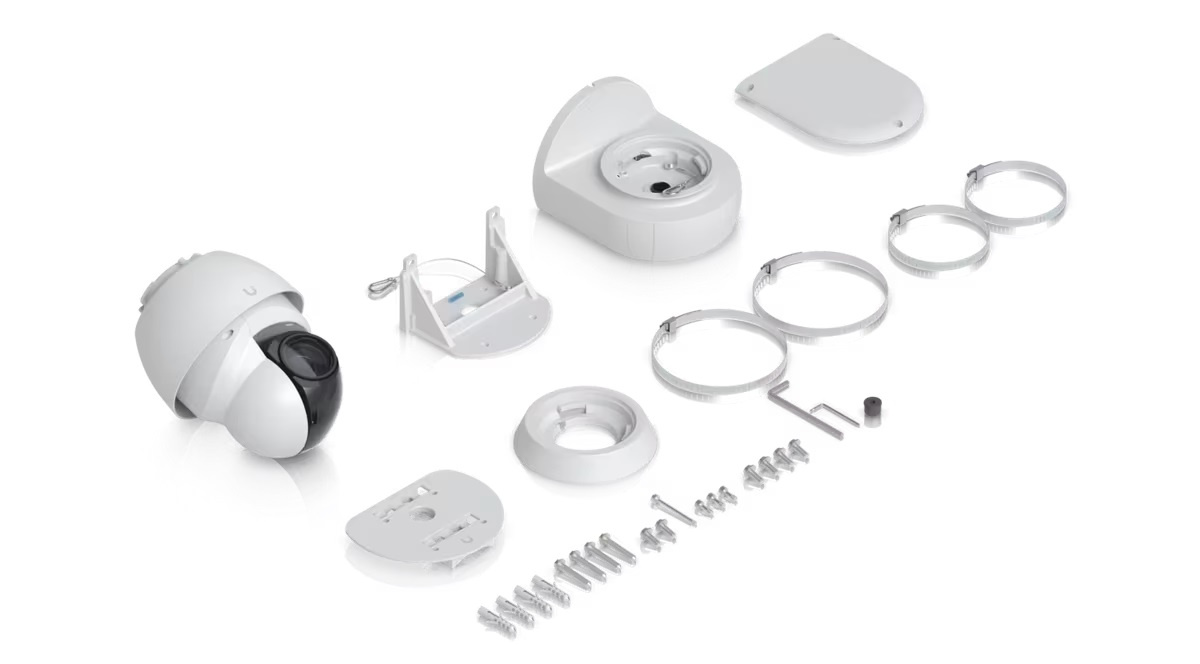 Jednou z bezprostředních výhod řady kamer UniFi AI je rozmanitost dodávaného montážního hardwaru. Kamera UniFi Protect PTZ nevyžaduje pro zahájení nasazení žádný další nákup.