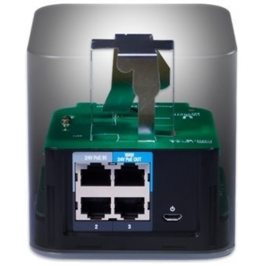 Napájení routeru je možné řešit jak přes napájecí adaptér, který není součástí balení, tak i pomocí 24V pasivního injektoru zapojeného do portu LAN, čímž bude možné napájet i venkovní jednotku jako např.: Loco, PowerBeam, NanoBeam a jiné klientské jednotky.