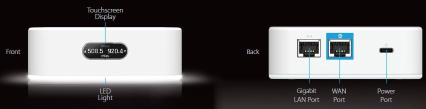 AFi-INS-R je samotný router AmpliFi, který se hodí k pokrytí menších prostor. Na přední straně je informační LCD displej, na zadní straně pak 1x WAN a 1x LAN port (oba 10/100/1000Mbps) a USB-C konektor pro připojení napájení. Elegantní a jednoduchý design se hodí do trendů moderního bydlení.