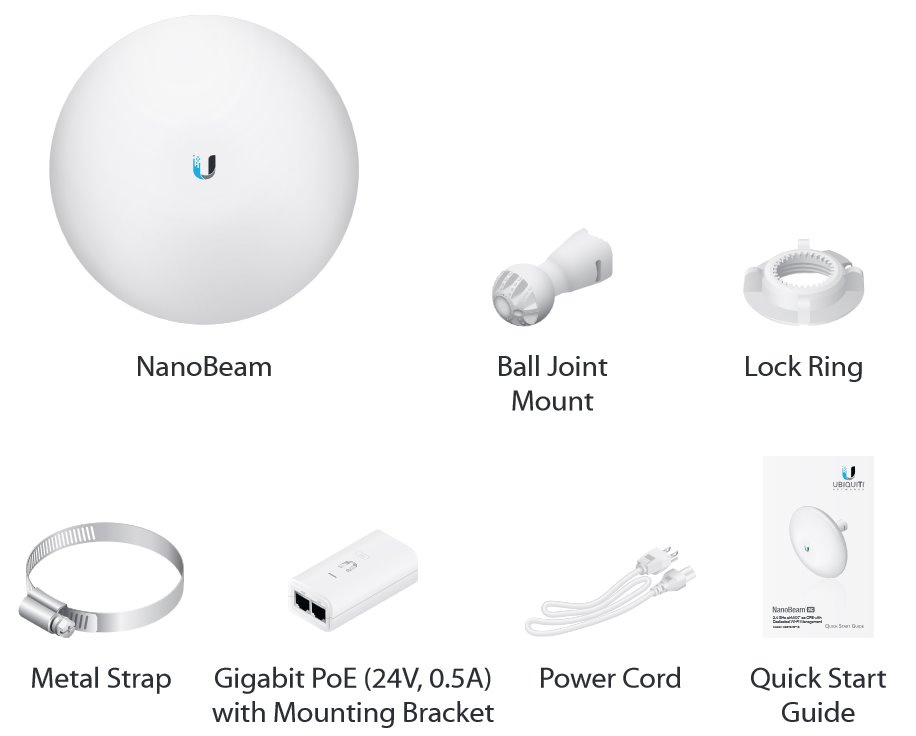 Uvnitř NanoBeamu se nachází výkonný MIPS procesor Atheros 74KC s frekvencí 533MHz, kterému sekunduje 64MB operační paměti typu DDR2. Síťový port podporuje 10/100/1000 Ethernet a lze po něm jednotku napájet pasivním Gigabit PoE 24V/0,5A adaptérem, který je součástí balení (aktivní PoE dle 802.3af není podporováno).