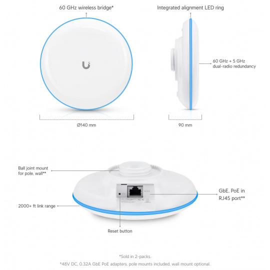 Popis produktu UniFi Building Bridge je 60GHz point-to-point pojítko s 5GHz zálohou pro rozšíření sítě například o sousední budovu. Propustnost pojítka je 1,7Gbps+ s maximálním dosahem 500m a správou nebo monitoringem přes UniFi Network application. Jednoduché zaměřování UBB má pro zaměřování po bocích integrované LED osvětlení, které indikuje, kterým směrem je potřeba jednotku pootočit pro získání lepšího signálu. Obsah balení * (2) zařízení * (2) kloubový držák na stožár * (2) Gigabit PoE napájecí adaptér 48V/0,32A * (2) napájecí kabel * (2) kovová stahovací páska Technické parametry Bezdrátové vlastnosti Přenosová rychlost WiFi - 5GHz [Mb/s]: 866 Přenosová rychlost - 60GHz [Mb/s]: 1700 Vysílací výkon 60GHz [dBm]: 36,5 Vyzař. úhel v azimutové rovině (-6dB) [°]: 60 Vyzař. úhel v elevační rovině (-6dB) [°]: 30 Zisk antény [dBi]: 17 Fyzické charakteristiky Provozní teplota [°C]: -40 až 70 Hmotnost [g]: 376 Hloubka [mm]: 90 Šířka [mm]: 140 Výška [mm]: 140 Konektory a rozhraní Rychlosti LAN: (1) 10/100/1000Mbps GPS modul: Ano Ostatní: Bluetooth Napájení Napájení přes PoE: 802.3af, 48V DC Typ napájení: PoE Max. spotřeba energie [W]: 11 Software Výchozí IP adresa: Dynamická z DHCP Výchozí jméno a heslo: Ubiquiti/Ubiquiti