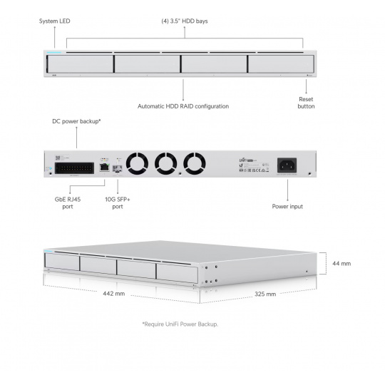 UniFi NVR je Enterprise zařízení, na kterém je předinstalovaný software UniFi Protect a je vybaveno 4 šachtami, do kterých lze umístit jak 2,5" tak 3,5" disky.