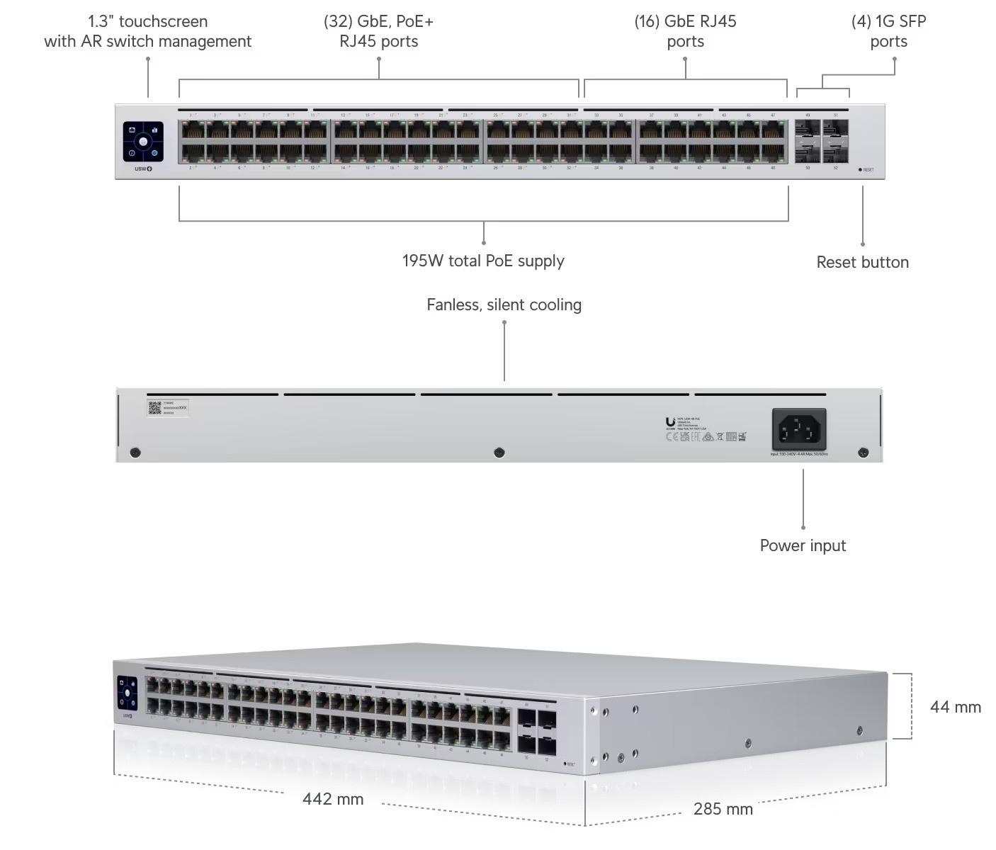 USW-48-POE je managovatelný Gigabitový L2 switch s 48x Gigabit LAN porty, z čehož 32 portů podporuje 802.3af/at PoE-Out, celkovým PoE Budgetem 195W a čtveřicí portů SFP s maximální přenosovou rychlostí 1Gb/s.