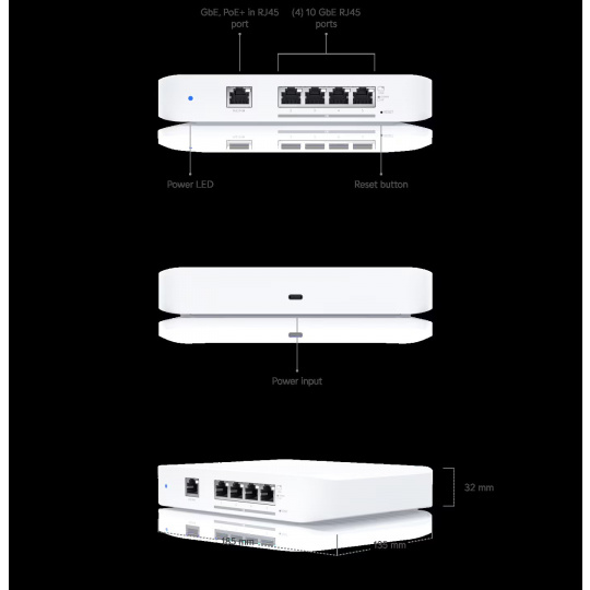UniFi Switch Flex XG od Ubiquiti Networks je plně managovatelný L2 UniFi Switch s (4) 10Gb ethernetovými porty a (1) Gigabit LAN podporující PoE IN (802.3af). Velmi kompaktní a bezventilátorové desktop provedení doplňují informační LED diody indikující stav linky. Switch je možné napájet přes první port pomocí PoE IN nebo přes USB-C na zadní straně.