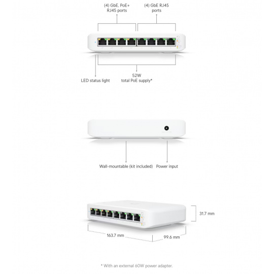 USW-Lite-8-PoE je Gigabitový PoE L2 Switch od Ubiquiti v desktop provedení s maximálním PoE budgetem 52W. Managovatelný switch s 8 Gigabit metalickými porty a celkovou propustnost 16Gb/s.