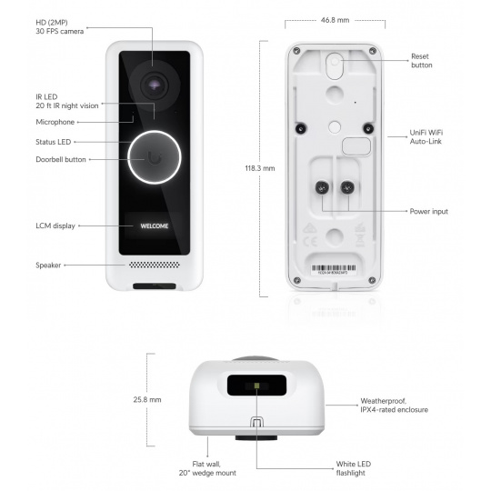 UniFi Protect G4 Doorbell je video zvonek s Wi-Fi, PIR senzorem, malým vestavěným displejem, mikrofonem a reproduktorem pro obousměrnou zvukovou komunikaci v reálném čase.