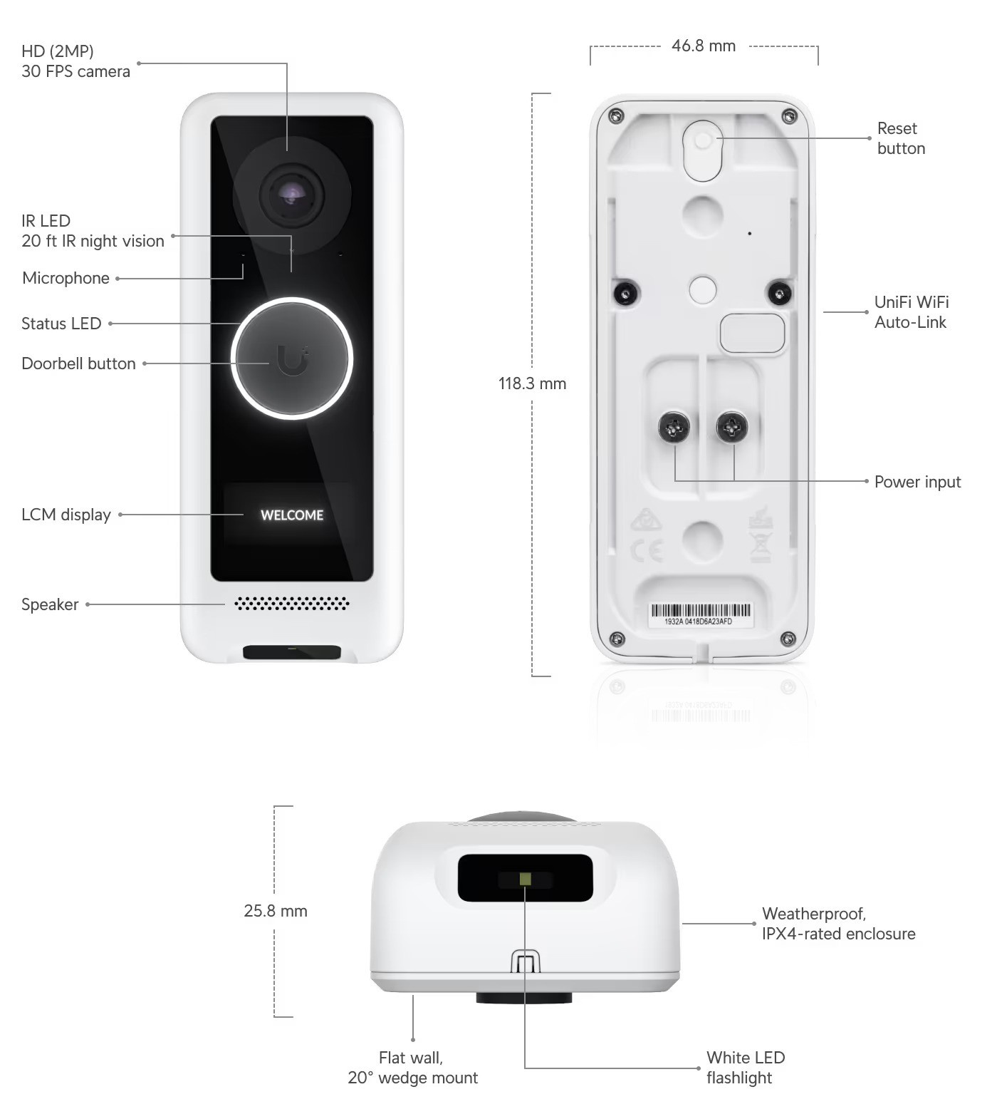 UniFi Protect G4 Doorbell je video zvonek s Wi-Fi, PIR senzorem, malým vestavěným displejem, mikrofonem a reproduktorem pro obousměrnou zvukovou komunikaci v reálném čase.