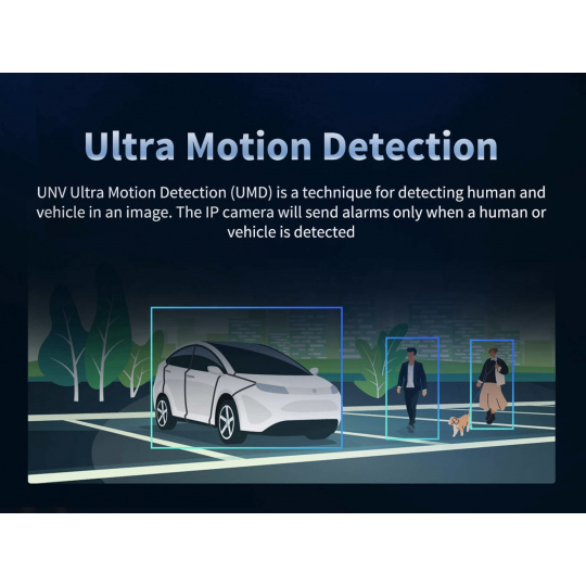 IPC2314LE-ADF40KM-WP využívá pokročilé videoanalytické funkce Ultra Motion Detection. Kamera rozpozná člověka nebo motorové vozidlo, na základě čehož teprve vyhodnotí detekci pohybu a udělá značku na časové ose v záznamovém zařízení, podle které pak rychle dohledáte, kdy došlo k zájmové události. Ultra Motion Detection tak velmi efektivně šetří Váš čas a urychluje dopadení pachatele. Díky funkci Ultra Motion Detection se kamera nenechá ovlivnit pavučinou před objektivem, chvěním listů, zvířectvem, deštěm, světlomety automobilů atp. Kamera je dále vybavena videoanalytickými funkcemi v podobě překročení čáry či narušení střežené zóny, které, ovšem, jsou na základě pixelové analýzy Human Body Detection, čili se hodí zejména do prostředí se stabilní scénou, jakou jsou interiéry. Pokud byste chtěli analýzy na základě rozpoznání člověka, doporučujeme kamery z řady Prime.