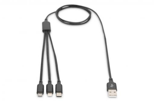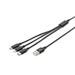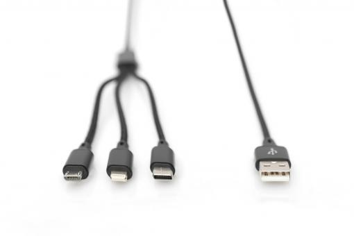 Nabíjecí kabel DIGITUS® 3 v 1 je ideální pro nabíjení přenosných zařízení pomocí konektorů USB-C™, Apple lightning nebo Micro-B do napájecího adaptéru, počítače nebo jiného zařízení pomocí portu USB A. K nabíjení všech zařízení použijte jeden kabel. Díky kompaktním rozměrům je tento kabel ideálním společníkem pro domácí, kancelářské nebo cestovní cesty.