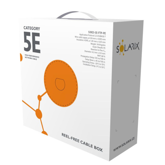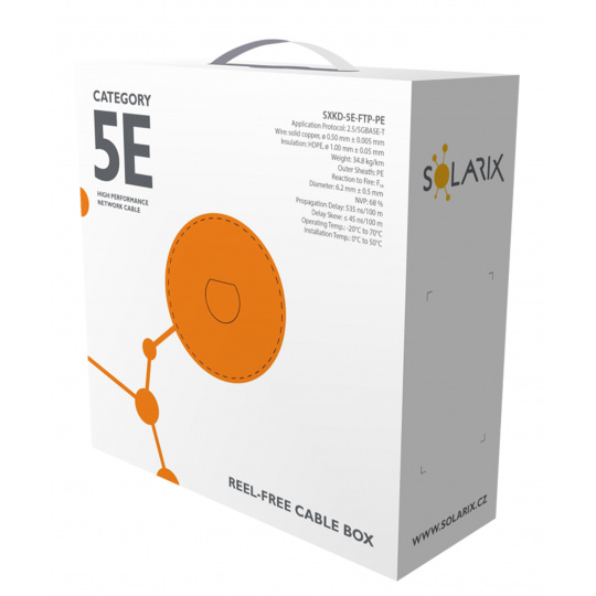 Instalační kabel Solarix s označením SXKD-5E-FTP-PE je spolehlivý venkovní stíněný kabel kategorie 5E, který je určený pro provoz ethernetových protokolů, včetně 2.5GBASE-T a 5GBASE-T*. Konstrukce kabelu je F/UTP, typ pláště UV stabilní PE s třídou reakce na oheň Fca a stupněm krytí IP67. Vodiče kabelu jsou vyrobeny z kvalitního měděného drátu s čistotou mědi 99,97 %. Kabel bez problémů splňuje požadavky z mezinárodních standardů ISO/IEC 11801, EN 50173 a ANSI/TIA 568.2-D. Stejně jako ostatní kabely Solarix, je i kabel SXKD-5E-FTP-PE značen metráží po 1 m v rozsahu od 0 do 100 m. Kabel je dodáván ve vysoce odolném třívrstvém leštěném kartónovém boxu (vždy barevně odlišeném podle typu kabelu), na kterém jsou uvedeny všechny nezbytné produktové informace, včetně čárových kódů, výrobní šarže, popisu a nejdůležitějších technických parametrů. Tento kabel není určen pro trvalé uložení do vody ani do země bez odpovídající řádné ochrany.