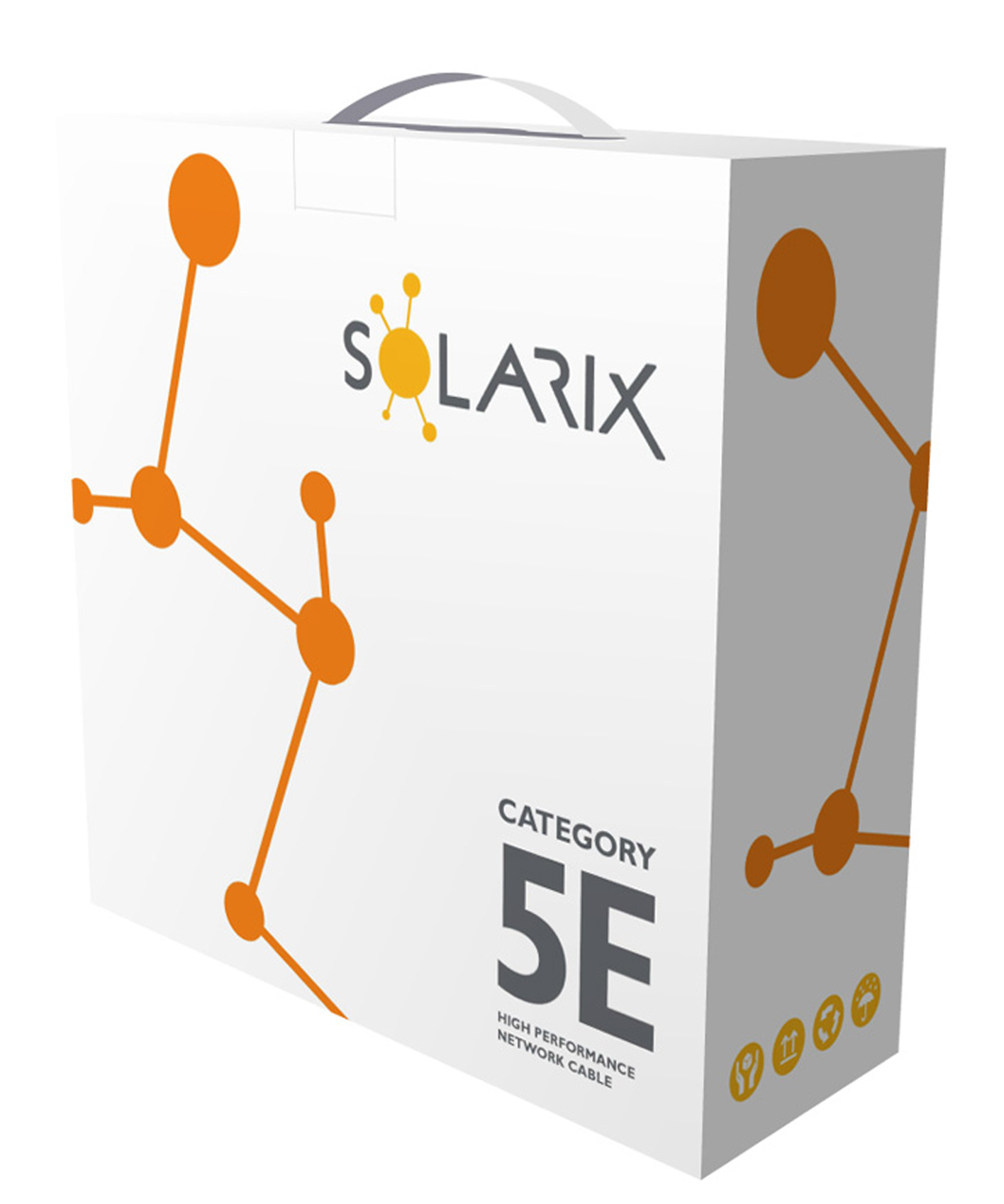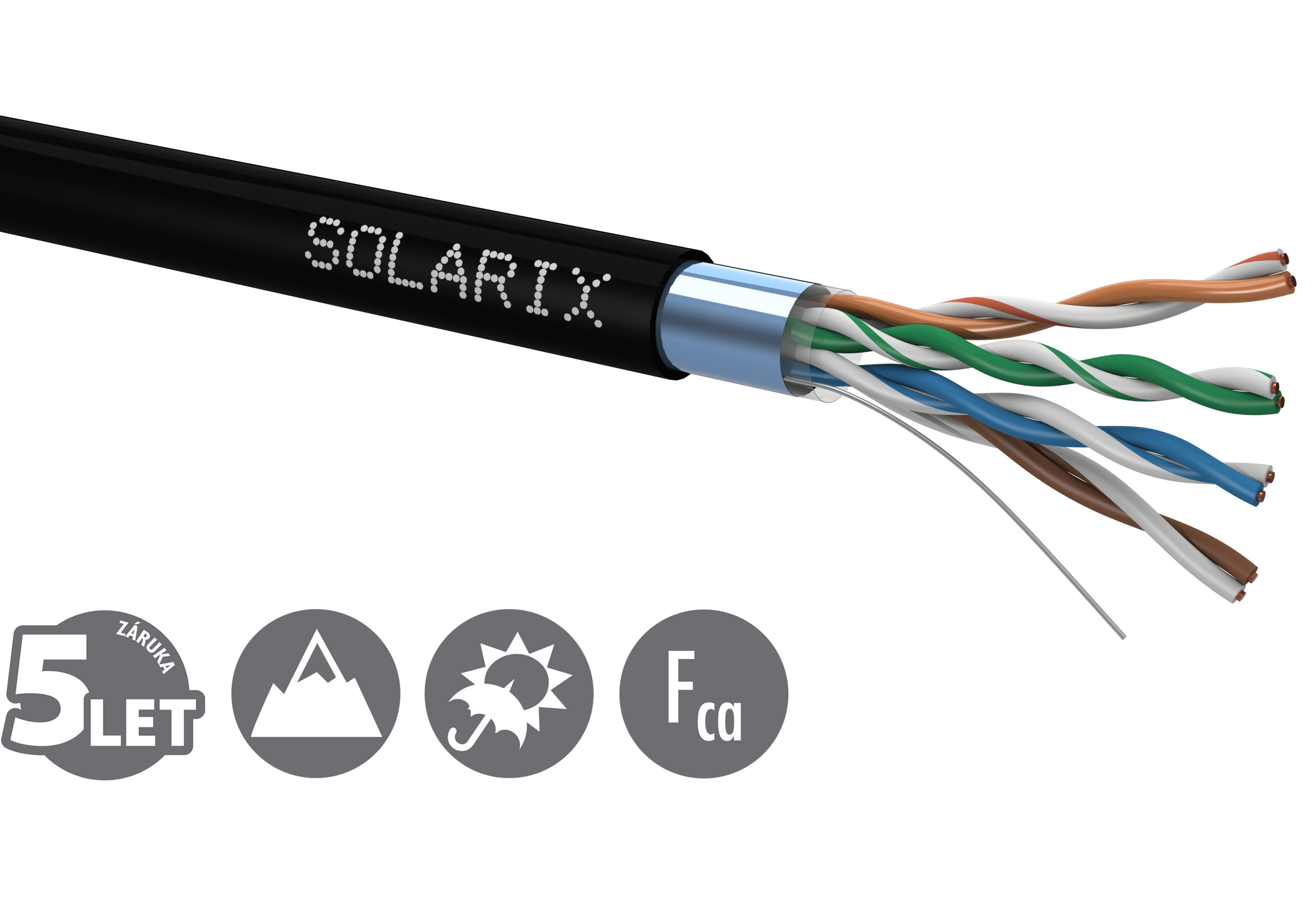 Instalační kabel Solarix s označením SXKD-5E-FTP-PE je spolehlivý venkovní stíněný kabel kategorie 5E, který je určený pro provoz ethernetových protokolů, včetně 2.5GBASE-T a 5GBASE-T*. Konstrukce kabelu je F/UTP, typ pláště UV stabilní PE s třídou reakce na oheň Fca a stupněm krytí IP67. Vodiče kabelu jsou vyrobeny z kvalitního měděného drátu s čistotou mědi 99,97 %. Kabel bez problémů splňuje požadavky z mezinárodních standardů ISO/IEC 11801, EN 50173 a ANSI/TIA 568.2-D. Stejně jako ostatní kabely Solarix, je i kabel SXKD-5E-FTP-PE značen metráží po 1 m v rozsahu od 0 do 100 m. Kabel je dodáván ve vysoce odolném třívrstvém leštěném kartónovém boxu (vždy barevně odlišeném podle typu kabelu), na kterém jsou uvedeny všechny nezbytné produktové informace, včetně čárových kódů, výrobní šarže, popisu a nejdůležitějších technických parametrů. Tento kabel není určen pro trvalé uložení do vody ani do země bez odpovídající řádné ochrany. Technické parametry Kategorie: CAT5E Podporované protokoly: 2.5/5GBASE-T a nižší Stínění: fólie kolem všech 4 párů Šířka pásma: 100 MHz Typ a velikost vodiče: měděný drát 0,50 mm ± 0,005 mm Izolace a průměr vodiče s izolací: HDPE 1,0 mm Třída reakce na oheň; typ pláště: Fca; PE Barva pláště: černá RAL 9005 Průměr kabelu: 6,2 mm Váha: 34,8 kg/km NVP: 68 % Propagation delay: 535 ns/100 m Delay skew: nižší než 45 ns/100 m Skladovací teplota: -20 °C až 70 °C Provozní teplota: -20 °C až 70 °C Teplota při instalaci: 0 °C až 50 °C Balení: 100 m, třívrstvý kartónový box Rozměry balení (výška x hloubka x šířka): 315 mm x 315 mm x 120 mm Počet balení na paletě: 30 boxů (velká paleta), 24 boxů (malá paleta)