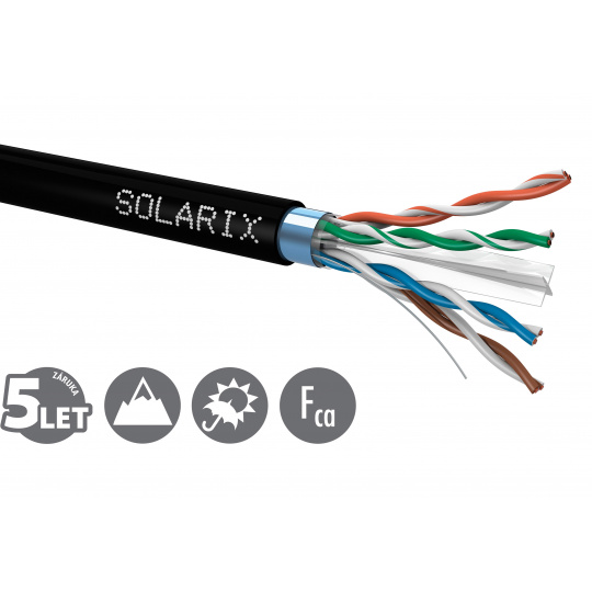 Instalační kabel Solarix s označením SXKD-6-FTP-PE je spolehlivý venkovní stíněný kabel kategorie 6 který je určený pro provoz ethernetových protokolů, včetně 2.5GBASE-T a 5GBASE-T. Konstrukce kabelu je F/UTP s plastovým křížem, který zajišťuje maximální oddělení párů od sebe po celé délce kabelu. Typ pláště je UV stabilní PE s třídou reakce na oheň Fca a stupněm krytí IP67. Vodiče kabelu jsou vyrobeny z kvalitního měděného drátu s čistotou mědi 99,97 %. Kabel bez problémů splňuje požadavky z mezinárodních standardů ISO/IEC 11801, EN 50173 a ANSI/TIA 568.2-D. Stejně jako ostatní kabely Solarix, je i kabel SXKD-6-FTP-PE značen metráží po 1 m v rozsahu od 0 do 500 m. Kabel je dodáván na vysoce pevné dřevěné špulce, na které jsou uvedeny všechny nezbytné produktové informace, včetně čárových kódů, výrobní šarže, popisu a nejdůležitějších technických parametrů. Tento kabel není určen pro trvalé uložení do vody ani do země bez odpovídající řádné ochrany.