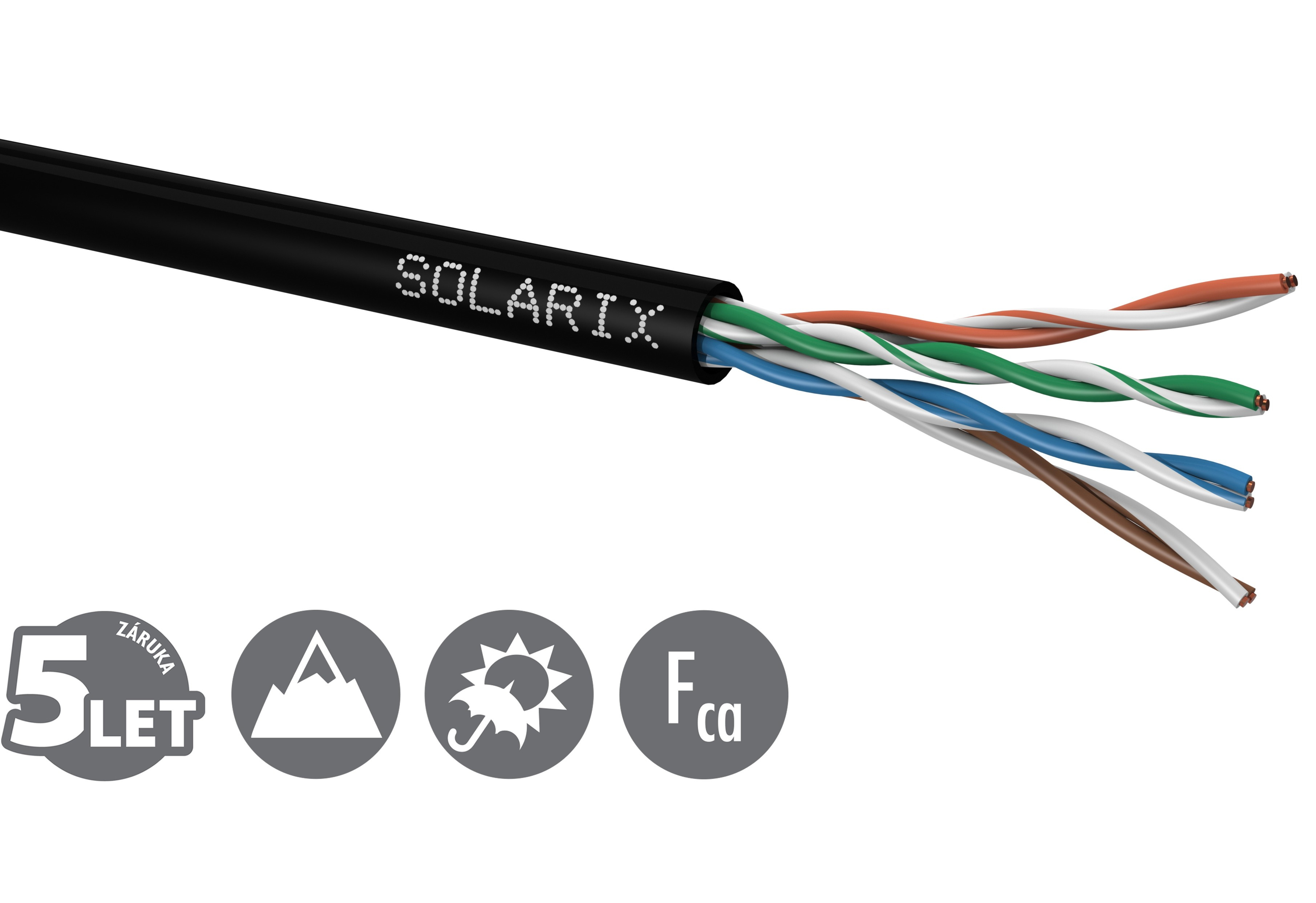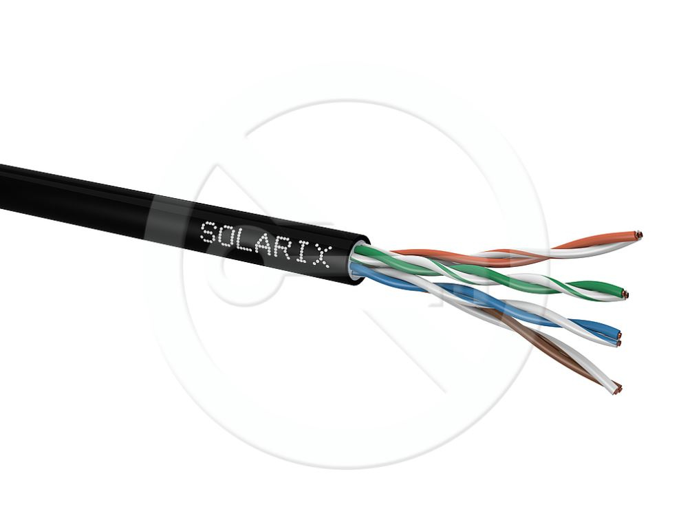 Instalační kabel Solarix s označením SXKD-5E-UTP-PEG je spolehlivý venkovní nestíněný kabel kategorie 5E, který je určený pro provoz ethernetových protokolů, včetně 2.5GBASE-T a 5GBASE-T*. Konstrukce kabelu je U/UTP, kabel je rovněž vyplněn gelem pro zajištění lepší odolnost proti vlhkosti. Typ pláště je UV stabilní PE s třídou reakce na oheň Fca a stupněm krytí IP67. Vodiče kabelu jsou vyrobeny z kvalitního měděného drátu s čistotou mědi 99,97 %. Kabel bez problémů splňuje požadavky z mezinárodních standardů ISO/IEC 11801, EN 50173 a ANSI/TIA 568.2-D. Stejně jako ostatní kabely Solarix, je i kabel SXKD-5E-UTP-PEG značen metráží po 1 m v rozsahu od 0 do 305 m. Kabel je dodáván ve vysoce odolném třívrstvém leštěném kartónovém boxu (vždy barevně odlišeném podle typu kabelu), na kterém jsou uvedeny všechny nezbytné produktové informace, včetně čárových kódů, výrobní šarže, popisu a nejdůležitějších technických parametrů. Tento kabel není určen pro trvalé uložení do vody ani do země bez odpovídající řádné ochrany. Technické parametry Kategorie: CAT5E Podporované protokoly: 2.5/5GBASE-T a nižší Stínění: ne Šířka pásma: 100 MHz Typ a velikost vodiče: měděný drát 0,50 mm ± 0,005 mm Izolace a průměr vodiče s izolací: HDPE 1,0 mm Třída reakce na oheň; typ pláště: Fca; PE Barva pláště: černá RAL 9005 Průměr kabelu: 5,6 mm Váha: 36,4 kg/km NVP: 68 % Propagation delay: 535 ns/100 m Delay skew: nižší než 45 ns/100 m Skladovací teplota: -20 °C až 70 °C Provozní teplota: -20 °C až 70 °C Teplota při instalaci: 0 °C až 50 °C Balení: 305 m, třívrstvý kartónový box Rozměry balení (výška x hloubka x šířka): 420 mm x 420 mm x 215 mm Počet balení na paletě: 30 boxů (velká paleta), 24 boxů (malá paleta)