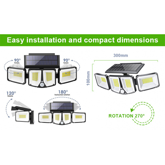 Solární LED světlo se 180 vysoce svítícími LED diodami je ideální k osvětlení venkovních prostor bez možnosti připojení k elektrické síti, jako je např. zahrada, vstup do domu atd. Díky solárnímu napájení je LED světlo zcela soběstačné a nezávislé na napájení z elektrické sítě. Jeho instalace je velice jednoduchá. Jste schopni osvětlit jakékoliv prostory za několik okamžiků a bez další potřeby kabeláže.