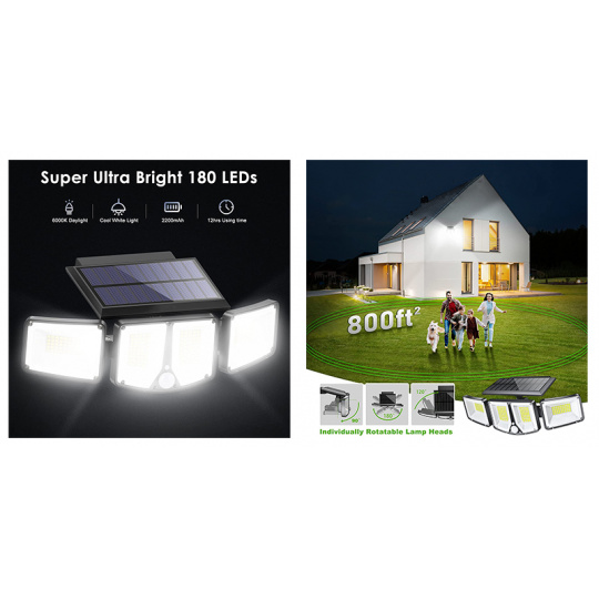 Solární LED světlo se 180 vysoce svítícími LED diodami je ideální k osvětlení venkovních prostor bez možnosti připojení k elektrické síti, jako je např. zahrada, vstup do domu atd. Díky solárnímu napájení je LED světlo zcela soběstačné a nezávislé na napájení z elektrické sítě. Jeho instalace je velice jednoduchá. Jste schopni osvětlit jakékoliv prostory za několik okamžiků a bez další potřeby kabeláže.