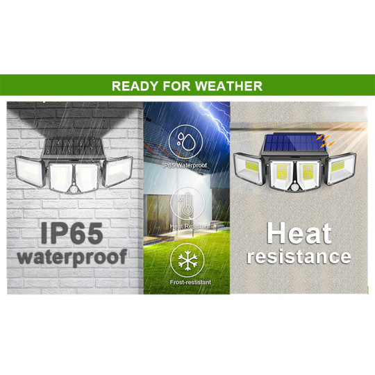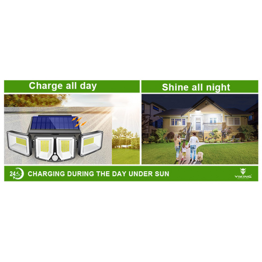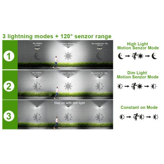 Baterie v solárním světle poskytuje dostatečný výkon pro celonoční osvětlení. Doba svitu záleží na intenzitě světla. Podle vybraného světelného režimu vám LED světlo vydrží svítit 8-12 hodin. Vestavěný pohybový senzor detekuje pohyb v rozmezí od 3 do 5 m v pozorovacím úhlu 120° a zároveň dokáže rozpoznat falešný pohyb (pohyb větví, vítr, atd.)