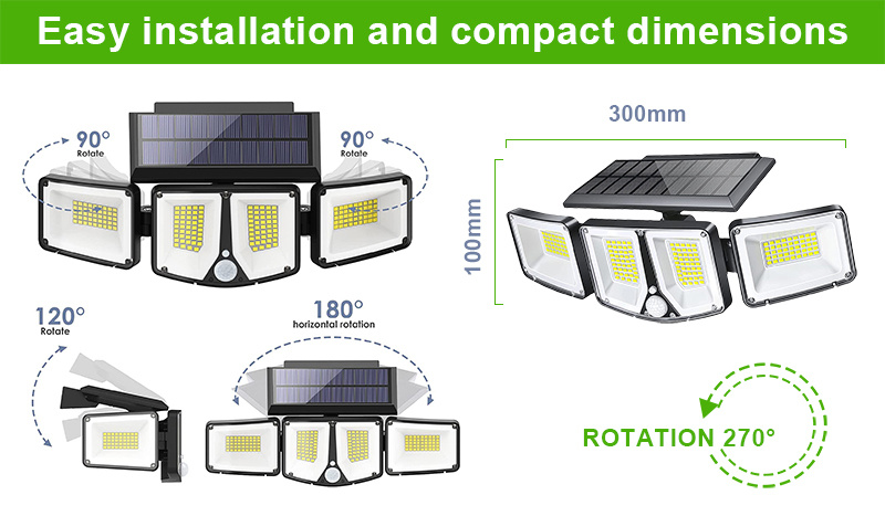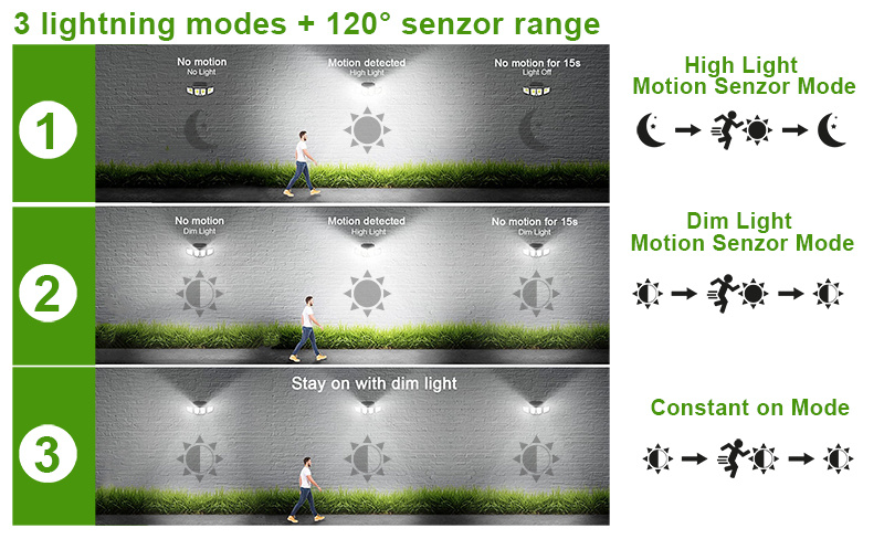 Baterie v solárním světle poskytuje dostatečný výkon pro celonoční osvětlení. Doba svitu záleží na intenzitě světla. Podle vybraného světelného režimu vám LED světlo vydrží svítit 8-12 hodin. Vestavěný pohybový senzor detekuje pohyb v rozmezí od 3 do 5 m v pozorovacím úhlu 120° a zároveň dokáže rozpoznat falešný pohyb (pohyb větví, vítr, atd.)