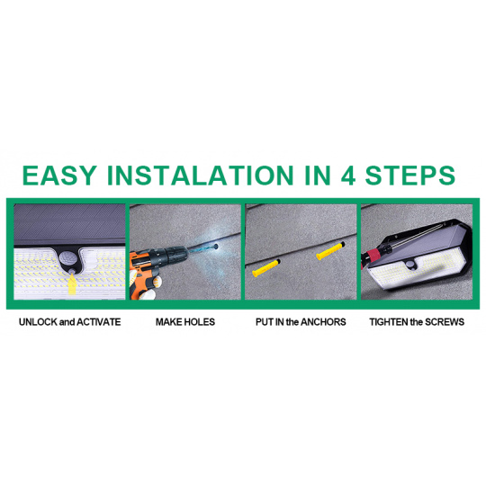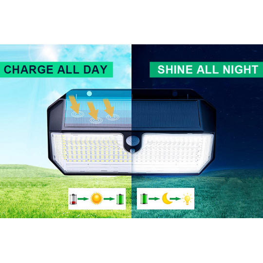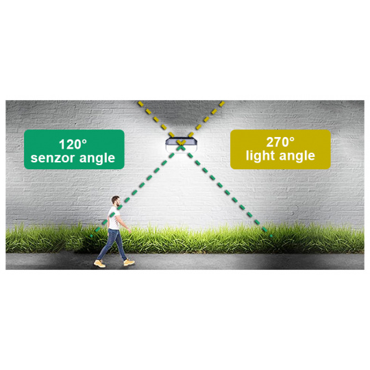 Baterie v solárním světle poskytuje dostatečný výkon pro celonoční osvětlení. Doba svitu záleží na intenzitě světla. Podle vybraného světelného režimu vám LED světlo vydrží svítit 8-12 hodin. Vestavěný pohybový senzor detekuje pohyb v rozmezí od 3 do 5 m v pozorovacím úhlu 120° a zároveň dokáže rozpoznat falešný pohyb (pohyb větví, vítr, atd.)