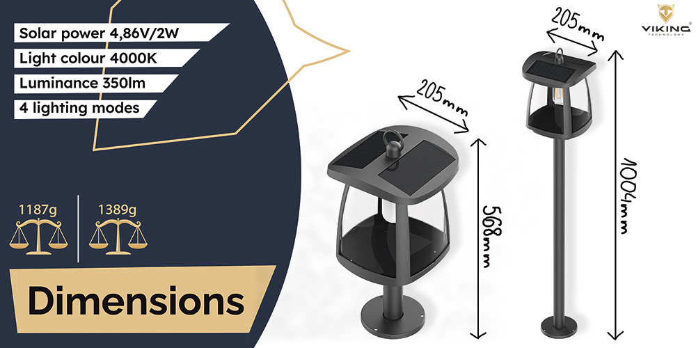 Svítivost 350 lm • solární napájení • barva světla 4000K (denní bílá) • 4 režimy osvětlení • doba osvětlení za nevhodných podmínek více než 10 dní • odolnost IP54 • kapacita baterie 3,7V/7,4Wh • výkon solárního panelu 4,86V/2W Venkovní solární LED světlo Viking SR10L Moderní solární LED světlo Viking SR10L kombinuje elegantní design, energetickou úspornost a vysokou spolehlivost. Je ideální pro nasvícení cest, chodníků, zahrad či okolí domu. S maximální svítivostí 350 lm a teplotou světla 4000 K poskytuje příjemné a rovnoměrné osvětlení s vysokou barevnou věrností (Ra80). Ovládání je velmi jednoduché pomocí jednoho tlačítka – dlouhý stisk slouží k zapnutí nebo vypnutí, krátkým stiskem pak můžete vybírat ze čtyř režimů intenzity osvětlení. Díky odolné konstrukci a stupni krytí IP54 je světlo vhodné i do náročnějších venkovních podmínek. Klíčové vlastnosti: •Svítivost až 350 lm •Příjemné LED osvětlení (4000K) s vysokou barevnou věrností (Ra80) •Solární napájení přes výkonný monokrystalický panel 4,86 V/2 W •4 režimy osvětlení ovládané pomocí tlačítka •Technologie ALS2.3 pro stabilní výkon i při horších světelných podmínkách •Odolné tělo z ABS+PET se stupněm krytí IP54 •Dlouhá výdrž – světlo vydrží svítit i více než 10 dní za nepříznivého počasí •Účinnost osvětlení až 110 lm/W •Kompaktní rozměry 19,8 x 19,8 x 100,4 cm vhodné pro zahrady, cesty i vchody Stylové a bezúdržbové venkovní osvětlení Viking SR10L je ideální volbou pro ty, kteří hledají stylové a úsporné venkovní osvětlení. Solární napájení a snadná instalace bez kabelů dělají ze světla Viking SR10L praktické řešení pro osvětlení různých venkovních prostor. Kvalitní monokrystalický solární panel s výkonem 4,86 V/2 W umožňuje efektivní nabíjení. Za nepříznivých podmínek světlo Viking SR10W vydrží svítit až 10 dní. Venkovní solární LED světlo Viking SR10L se skvěle hodí na zahrady, příjezdové cesty, terasy a vchodové prostory. Obsah balení: 1 ks - Venkovní solární LED světlo Viking SR10L 1 ks - Podstavec 2 ks - Nosná tyč Technické specifikace světla: •Model: Venkovní solární LED světlo Viking SR10L •Svítivost: 350 lm •Barva světla: 4000K, Ra80 •Typ světla: Doba osvětlení za nevhodných podmínek: >10 dní Režim ovládání: tlačítko, zapnutí/vypnutí stisknutím na 1,5s krátkým stisknutím se změní režim osvětlení •Režim osvětlení: M1:25 % do svítání M2:50% do svítání M3:75% do svítání M4:100% do svítání •Technologie: ALS2.3 •Ochrana: IP54 •Materiál: ABS+PET •Rozměry: 19,8x19,8x100,4cm Technické specifikace solárního panelu: •Typ: Monokrystalický •Výkon: 4,86V/2W Technické specifikace baterie: •Typ baterie: Li-ion •Kapacita: 3,7V/7,4Wh •Teplota nabíjení/vybíjení: 0~45°C/-20~60°C •Doba nabíjení: •Účinnost: 110lm/W •Hmotnost celého produktu: