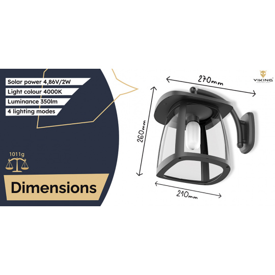 Svítivost 350 lm • solární napájení • barva světla 4000K (denní bílá) • 4 režimy osvětlení • doba osvětlení za nevhodných podmínek více než 10 dní • odolnost IP54 • kapacita baterie 3,7V/7,4Wh • výkon solárního panelu 4,86V/2W Venkovní solární LED světlo Viking SR10W Solární světlo Viking SR10W nabízí spolehlivé venkovní osvětlení s jednoduchou instalací a bez nutnosti připojení k elektrické síti. Díky svému výkonnému solárnímu panelu, modernímu designu a svítivosti 350 lm je ideální pro nasvícení zahradních cest, vstupních prostor nebo okolí domu. K ovládání slouží jedno tlačítko, kterým světlo snadno zapnete, vypnete i přepínáte mezi čtyřmi režimy svícení. Technologie ALS2.3 zajišťuje, že světlo zůstává funkční i při proměnlivých světelných podmínkách. Klíčové vlastnosti: •Svítivost až 350 lm •Příjemné LED osvětlení (4000K) s vysokou barevnou věrností (Ra80) •Solární napájení přes výkonný monokrystalický panel 4,86 V/2 W •4 režimy osvětlení ovládané pomocí tlačítka •Technologie ALS2.3 pro stabilní výkon i při horších světelných podmínkách •Odolné tělo z ABS+PET se stupněm krytí IP54 •Dlouhá výdrž – světlo vydrží svítit i více než 10 dní za nepříznivého počasí •Účinnost osvětlení až 110 lm/W •Kompaktní rozměry 27 × 26 × 21 cm vhodné pro zahrady, cesty i vchody •Moderní a bezúdržbové osvětlení Viking SR10W je ideální volbou pro ty, kteří hledají stylové a úsporné venkovní osvětlení. Solární napájení a snadná instalace bez kabelů dělají ze světla Viking SR10W praktické řešení pro osvětlení různých venkovních prostor. Použitý monokrystalický solární panel disponuje výkonem 4,86 V/2 W. Pokud venku panují nevhodné podmínky, světlo Viking SR10W dokáže fungovat až 10 dní. Venkovní solární LED světlo Viking SR10W se skvěle hodí na zahrady, příjezdové cesty, terasy i vchodové prostory. Obsah balení: 1 ks - Venkovní solární LED světlo Viking SR10W 1 ks - Držák pro světlo Technické specifikace světla: •Model: Venkovní solární LED světlo Viking SR10W •Svítivost: 350 lm •Barva světla: 4000K, Ra80 Typ světla: •Doba osvětlení za nevhodných podmínek: >10 dní Režim ovládání: tlačítko, zapnutí/vypnutí stisknutím na 1,5s krátkým stisknutím se změní režim osvětlení Režim osvětlení: •M1:25 % do svítání •M2:50% do svítání •M3:75% do svítání •M4:100% do svítání •Technologie: ALS2.3 •Ochrana: IP54 •Materiál: ABS+PET •Rozměry: 27x26x21 cm Technické specifikace solárního panelu: •Typ: Monokrystalický •Výkon: 4,86V/2W Technické specifikace baterie: •Typ baterie: Li-ion •Kapacita: 3,7V/7,4Wh •Teplota nabíjení/vybíjení: 0~45°C/-20~60°C •Doba nabíjení: •Účinnost: 110lm/W •Hmotnost celého produktu: 1011g