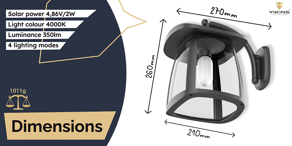 Svítivost 350 lm • solární napájení • barva světla 4000K (denní bílá) • 4 režimy osvětlení • doba osvětlení za nevhodných podmínek více než 10 dní • odolnost IP54 • kapacita baterie 3,7V/7,4Wh • výkon solárního panelu 4,86V/2W Venkovní solární LED světlo Viking SR10W Solární světlo Viking SR10W nabízí spolehlivé venkovní osvětlení s jednoduchou instalací a bez nutnosti připojení k elektrické síti. Díky svému výkonnému solárnímu panelu, modernímu designu a svítivosti 350 lm je ideální pro nasvícení zahradních cest, vstupních prostor nebo okolí domu. K ovládání slouží jedno tlačítko, kterým světlo snadno zapnete, vypnete i přepínáte mezi čtyřmi režimy svícení. Technologie ALS2.3 zajišťuje, že světlo zůstává funkční i při proměnlivých světelných podmínkách. Klíčové vlastnosti: •Svítivost až 350 lm •Příjemné LED osvětlení (4000K) s vysokou barevnou věrností (Ra80) •Solární napájení přes výkonný monokrystalický panel 4,86 V/2 W •4 režimy osvětlení ovládané pomocí tlačítka •Technologie ALS2.3 pro stabilní výkon i při horších světelných podmínkách •Odolné tělo z ABS+PET se stupněm krytí IP54 •Dlouhá výdrž – světlo vydrží svítit i více než 10 dní za nepříznivého počasí •Účinnost osvětlení až 110 lm/W •Kompaktní rozměry 27 × 26 × 21 cm vhodné pro zahrady, cesty i vchody •Moderní a bezúdržbové osvětlení Viking SR10W je ideální volbou pro ty, kteří hledají stylové a úsporné venkovní osvětlení. Solární napájení a snadná instalace bez kabelů dělají ze světla Viking SR10W praktické řešení pro osvětlení různých venkovních prostor. Použitý monokrystalický solární panel disponuje výkonem 4,86 V/2 W. Pokud venku panují nevhodné podmínky, světlo Viking SR10W dokáže fungovat až 10 dní. Venkovní solární LED světlo Viking SR10W se skvěle hodí na zahrady, příjezdové cesty, terasy i vchodové prostory. Obsah balení: 1 ks - Venkovní solární LED světlo Viking SR10W 1 ks - Držák pro světlo Technické specifikace světla: •Model: Venkovní solární LED světlo Viking SR10W •Svítivost: 350 lm •Barva světla: 4000K, Ra80 Typ světla: •Doba osvětlení za nevhodných podmínek: >10 dní Režim ovládání: tlačítko, zapnutí/vypnutí stisknutím na 1,5s krátkým stisknutím se změní režim osvětlení Režim osvětlení: •M1:25 % do svítání •M2:50% do svítání •M3:75% do svítání •M4:100% do svítání •Technologie: ALS2.3 •Ochrana: IP54 •Materiál: ABS+PET •Rozměry: 27x26x21 cm Technické specifikace solárního panelu: •Typ: Monokrystalický •Výkon: 4,86V/2W Technické specifikace baterie: •Typ baterie: Li-ion •Kapacita: 3,7V/7,4Wh •Teplota nabíjení/vybíjení: 0~45°C/-20~60°C •Doba nabíjení: •Účinnost: 110lm/W •Hmotnost celého produktu: 1011g