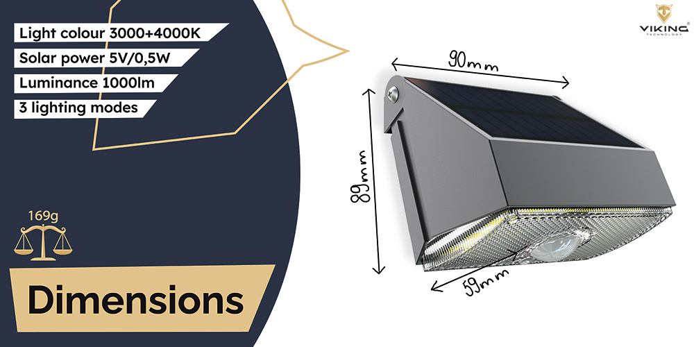 Solární LED světlo Viking SR11 nabízí kompaktní, ale výkonné řešení pro venkovní osvětlení s důrazem na bezpečnost a energetickou úspornost. Díky svítivosti až 1000 lm, dvěma teplotám světla (3000 K + 4000 K) a pohybovému senzoru je vhodné pro osvětlení vstupů, chodeb, garážových vjezdů či zahradních cest.