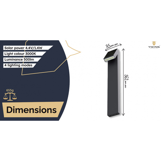 Použitý monokrystalický solární panel disponuje výkonem 4,4 V/1,4 W. Pokud venku panují nevhodné podmínky, světlo Viking SR15L dokáže fungovat až 3 dny. S odolností proti vodě a prachu (IP65) je připraven na jakékoliv venkovní podmínky.