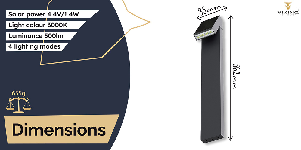 Použitý monokrystalický solární panel disponuje výkonem 4,4 V/1,4 W. Pokud venku panují nevhodné podmínky, světlo Viking SR15L dokáže fungovat až 3 dny. S odolností proti vodě a prachu (IP65) je připraven na jakékoliv venkovní podmínky.