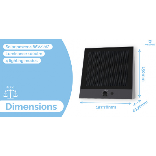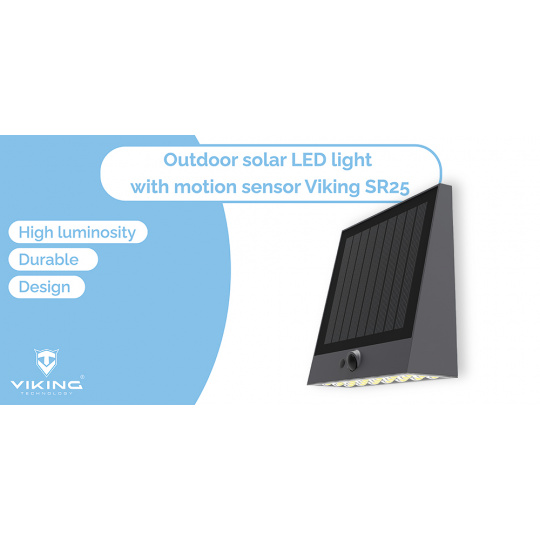 PIR senzor s úhlem detekce 120° má dosah až 5 metrů. Jakmile bude detekován pohyb, světlo se automaticky rozsvítí. Moderní a výkonný monokrystalický solární panel poskytuje vysoký nabíjecí výkon. Viking SR25 disponuje robustním provedením s certifikovaným stupněm odolnosti IP54.