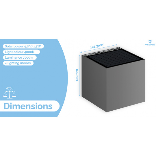 Svítivost 700 lm • solární napájení • barva světla 4000K (denní bílá) • 4 režimy osvětlení • doba osvětlení za nevhodných podmínek více než 10 dní • odolnost IP54 • kapacita baterie 3,7V/7,4Wh • výkon solárního panelu 4,8 V/1,5W