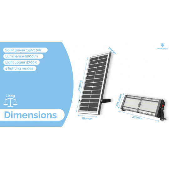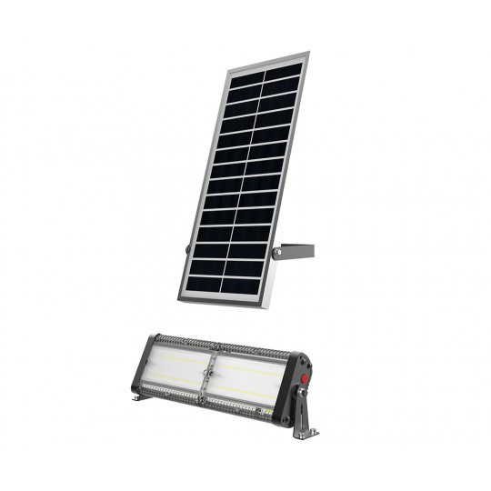 Svítivost 6000 lm • solární napájení • barva světla 5700K (studená bílá) • 4 režimy osvětlení • doba osvětlení za nevhodných podmínek více než 3 dny • odolnost IP65 • kapacita baterie 3,7V/57,72 Wh • výkon solárního panelu 14V/10W