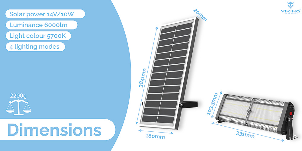 Svítivost 6000 lm • solární napájení • barva světla 5700K (studená bílá) • 4 režimy osvětlení • doba osvětlení za nevhodných podmínek více než 3 dny • odolnost IP65 • kapacita baterie 3,7V/57,72 Wh • výkon solárního panelu 14V/10W