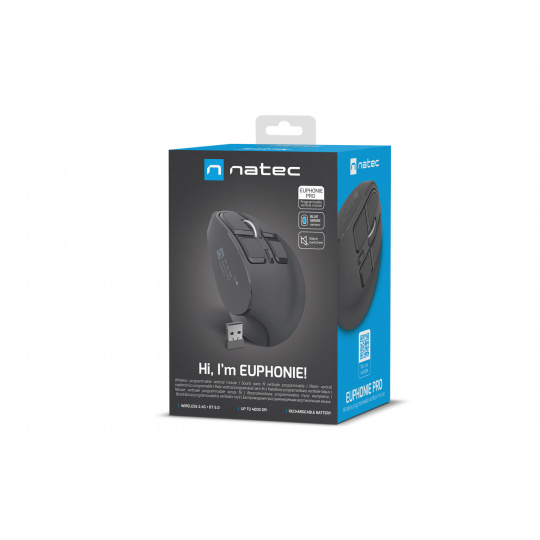 Natec Euphonie Pro je jedna z nejmodernějších vertikálních kancelářských myší, navržená pro pohodlnou práci v ergonomických podmínkách. Myš zaručuje nadstandardní bezdrátové připojení, špičkový senzor, širokou škálu funkcí a tvar, který pomáhá udržovat zdraví zápěstí. Navíc je vybavena tichými spínači, které výrazně zvyšují komfort práce, eliminují hluk a umožňují diskrétnější používání zařízení v kanceláři nebo doma, což je důležité zejména při dlouhodobém používání.