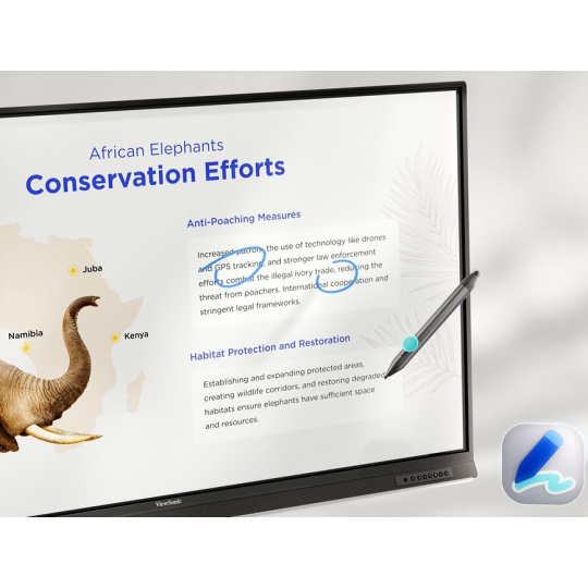 Pomocí aktivního pera provedete rychlé úpravy poznámek, zvýrazníte důležité informace pomocí barev - vylepšete své vizuální prvky a zaujměte snadno pomocí aktivního stylusu ViewSonic.